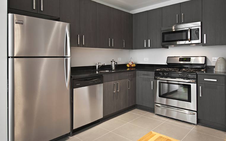 A full stainless steel appliance package, granite counters and frameless embossed wood cabinets.